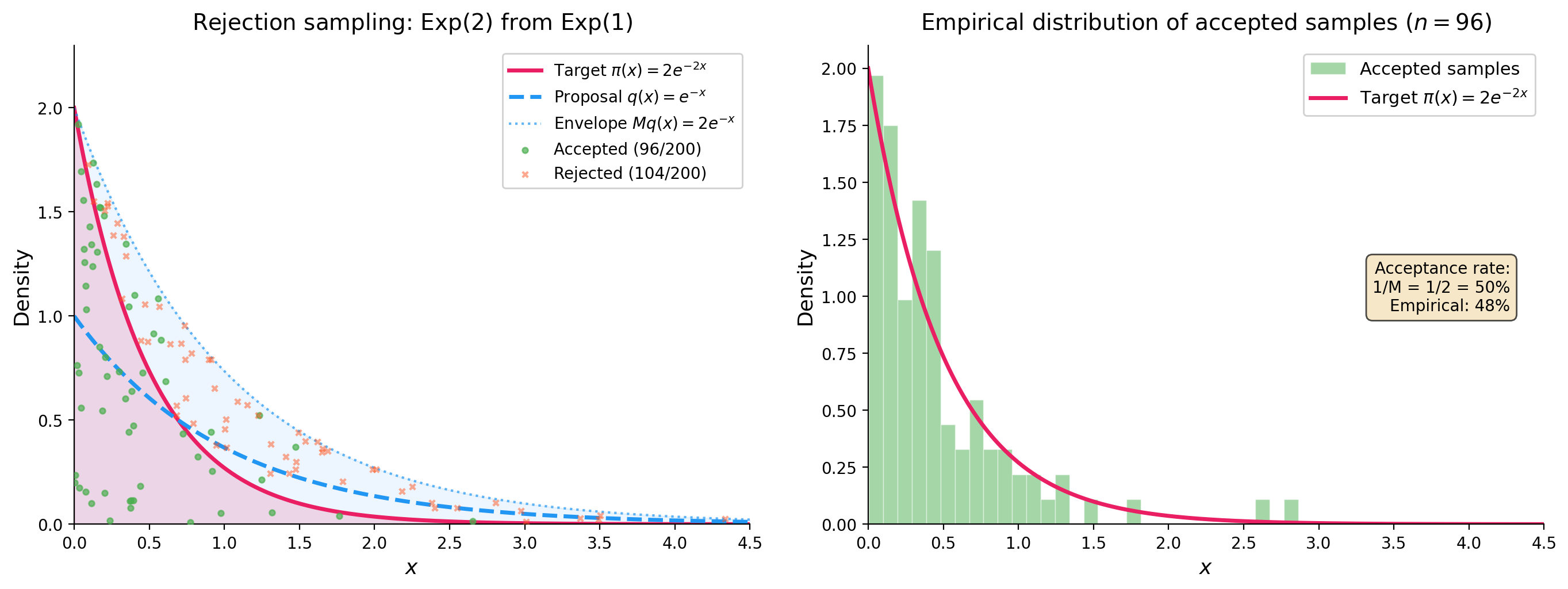 To make this concrete, here is a simple example: sampling from an \(\mathrm{Exp}(2)\) target using an \(\mathrm{Exp}(1)\) proposal. The weight function is \(\omega(x) = 2e^{-2x}/e^{-x} = 2e^{-x}\), which achieves its supremum \(M = 2\) at \(x = 0\). The acceptance rate is \(1/M = 50\%\), meaning half the proposals are wasted.